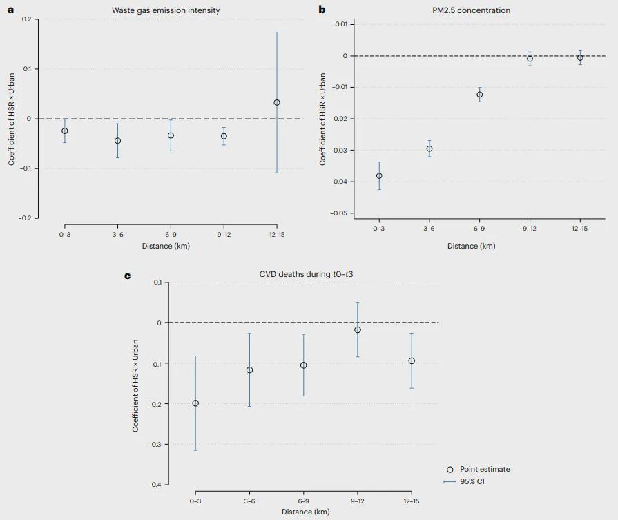 图 5. 高速铁路开通在城乡地区不均衡影响的空间格局。a–c,我们展示了高速铁路开通在城乡地区对企业级废气排放强度(a)、PM2.5浓度(b)及心血管疾病累计死亡人数(c)方面的不均衡影响,距离维度为距高速铁路车站不同距离。效应通过公式(4)、(8)和(12)估计。我们构建了五个缓冲环:0–3 km、3–6 km、6–9 km、9–12 km 和 12–15 km。我们排除了距高速铁路车站超过15 km的样本,因为距高速铁路车站超过15 km的城市与农村样本量存在巨大差异(补充表2)。所有因变量均采用反双曲正弦变换(即 arsinh(x) = log[x + √x² + 1])。数据以HSR×Urban估计系数(点)±95%置信区间(误差线)呈现。详细结果列于补充表11–13。